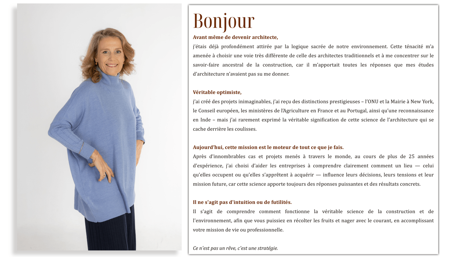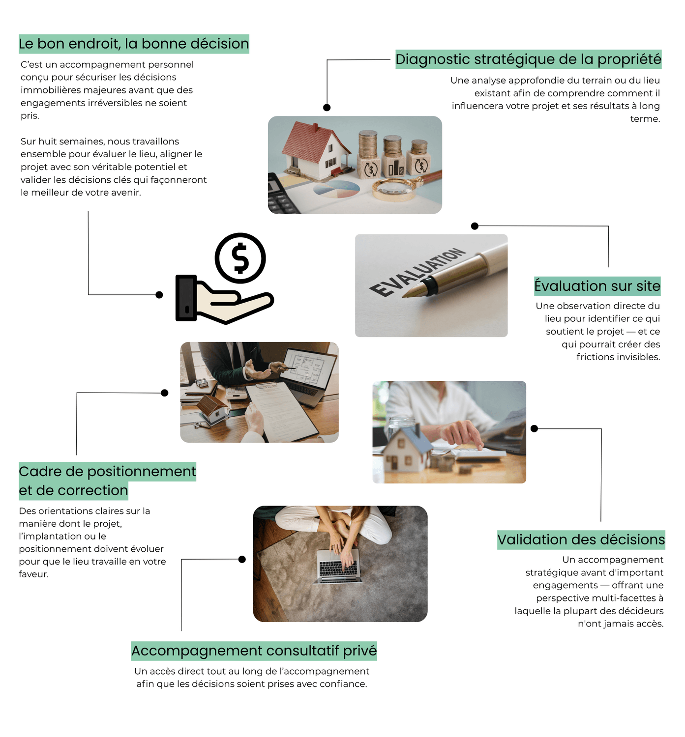 Cet accompagnement est conçu pour les personnes responsables de décisions importantes concernant un terrain ou un bien immobilier, lorsque l’impact à long terme du lieu compte véritablement.